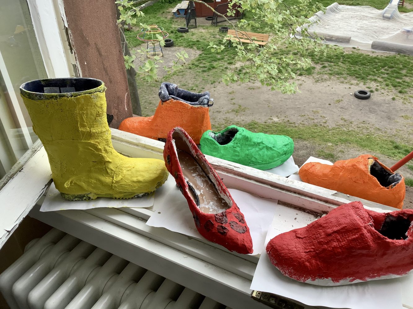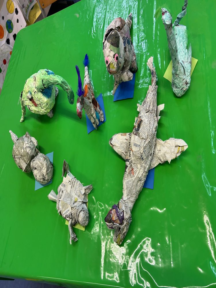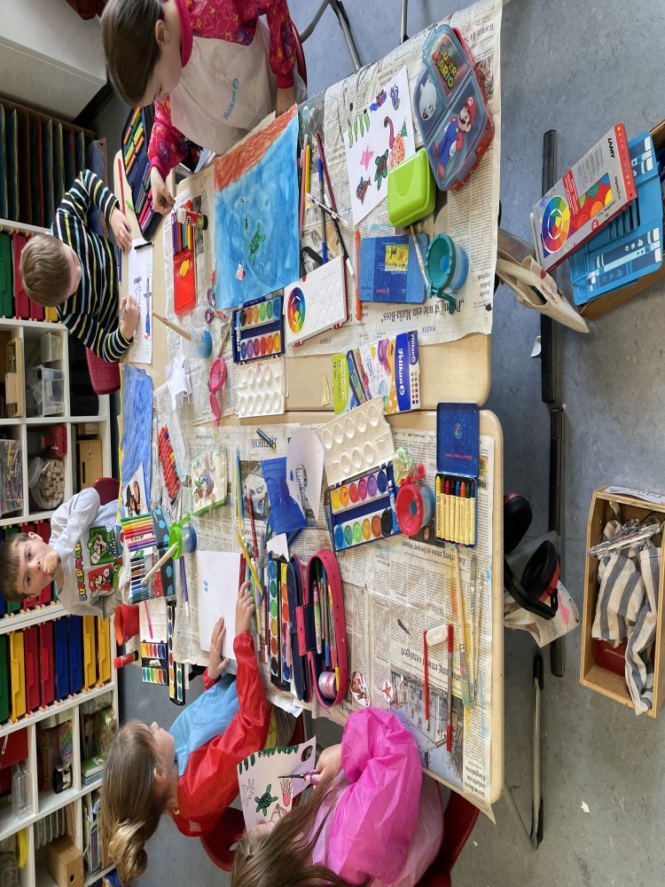 Die diesjährige Projektwoche stand unter dem Thema „Kunst und Kreatives“. Mit knapper Mehrheit hatte das Thema in einer Abstimmung unter den Kindern gewonnen. Jede Klassenlehrkraft bereitete in den letzten Wochen ein künstlerisches Projekt für die Dauer von zwei Projekttagen vor, sodass die Kinder an zwei unterschiedlichen Projekten teilnehmen konnten. In den vielen verschiedenen Kreativprojekten für die Klassen 1 bis 4 wurde mit den unterschiedlichsten Materialien gearbeitet: Es wurden Gipsmasken gestaltet und Gipsschuhe nach Hundertwasser kreiert. In einem Projekt ging es rund um Dinosaurier, bei dem aus Pappmachee eigene Dinos hergestellt, Kurzfilme gedreht und getanzt wurde. Rund um Burgen und Ritter ging es in einem anderen Workshop. Hier wurden Ritterburgen gebaut, eigene Wappen bemalt und Nagelbilder hergestellt.