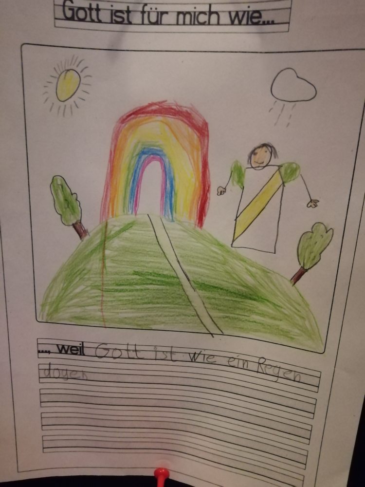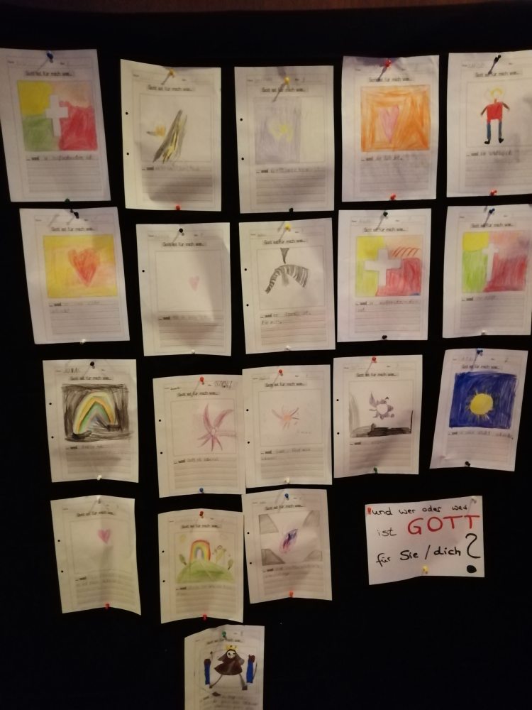 Dieses Jahr nahm auch die katholische Kirchengemeinde St. Bartholomäus teil, die gemeinsam mit den zweiten Klassen der Gustav-Wiederkehrschule mit der Außenstelle Bartholomäusschule religiöse Kunstwerke zum Thema „Gottesvorstellungen“ präsentierte. Die Kinder zeichneten mithilfe von Symbolkarten aus der Symbolkartei des Religionspädagogen Rainer Oberthür ihre eigene Vorstellung von Gott und beschrieben diese. „Wir hatten bei der langen Nacht der Kunst und Genüsse ca. 490 Besucher*innen. Mit so viel Andrang hatten wir nicht gerechnet!“, freute sich Ulrich Diehl von der Bartholomäusgemeinde und bedankte sich bei den Kindern für ihre tollen Kunstwerke: „Es waren auch einige Kinder da, die ihre Bilder betrachtet haben.“ Die Gemälde luden die Besucher in der abgedunkelten mit Kerzen beleuchteten Kirche zum Gespräch und Austausch ein.
